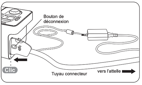 Raccorder l’extrémité plus petite du tuyau connecteur (dotée d’un bouton bleu ou gris) à l’attelle. S’assurer qu’un clic est entendu. Pour déconnecter, il suffit d’appuyer sur le bouton bleu ou gris et de retirer le connecteur de l’attelle.